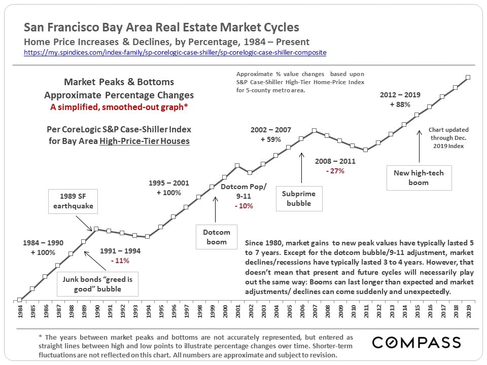 ​​​​​​​This first chart is a very simplified, smoothed out look at Bay Area market cycles for higher-price-tier homes using data from the Sand P CoreLogic Case-Shiller Home Price Index. It is a very approximate overview of hundreds of different neighborhood markets - whose trends up and down were broadly similar, but whose details, such as specific appreciation percentages, varied.
