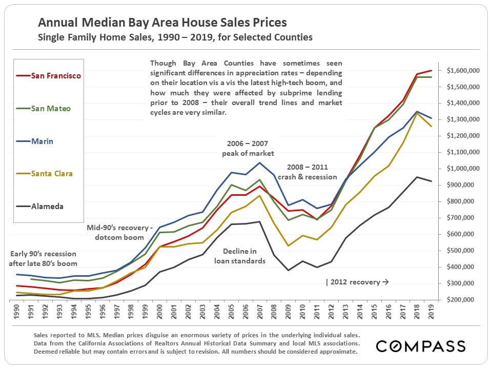 The following chart uses the median house sales price trends of 5 Bay Area counties to illustrate a simple fact: The entire Bay Area generally follows the same broad trend lines in market cycles. Of course, there are differences by location, property type and price segment, but overall cycles are very similar. (We picked 5 counties as samples, because adding them all over-clutters the chart.)
