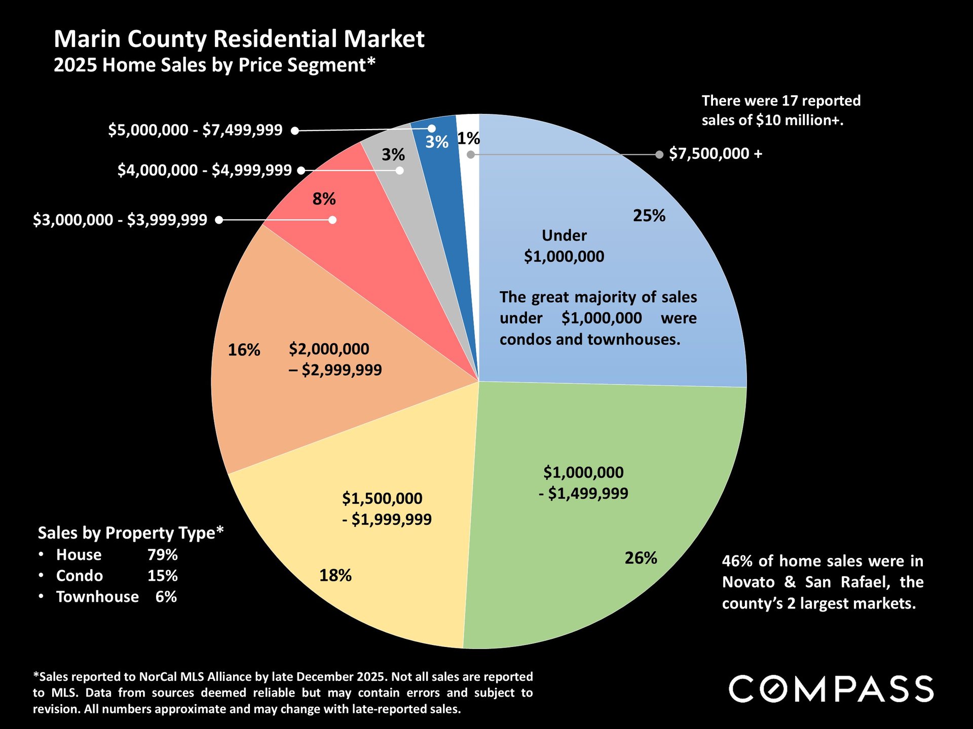 The Marin County market in 2025 cooled modestly from the pace of 2024, with median single-family home prices finishing the year essentially flat. That said, Marin continued to outperform many surrounding markets. Affluent buyers remained active, supported by equity gains and easing rates, while more price-sensitive segments faced headwinds from inflation and affordability constraints.