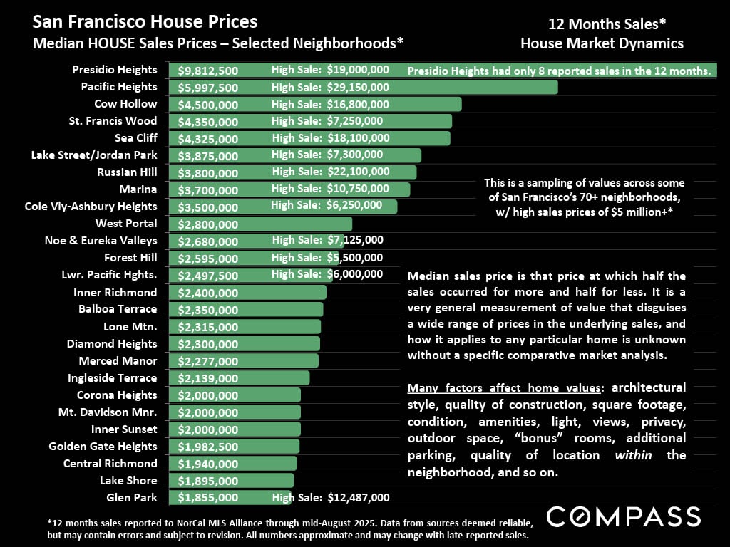 - Houses: The 3-month rolling median house sales price in August 2025 increased by 3% year-over-year but declined from the spring peak.