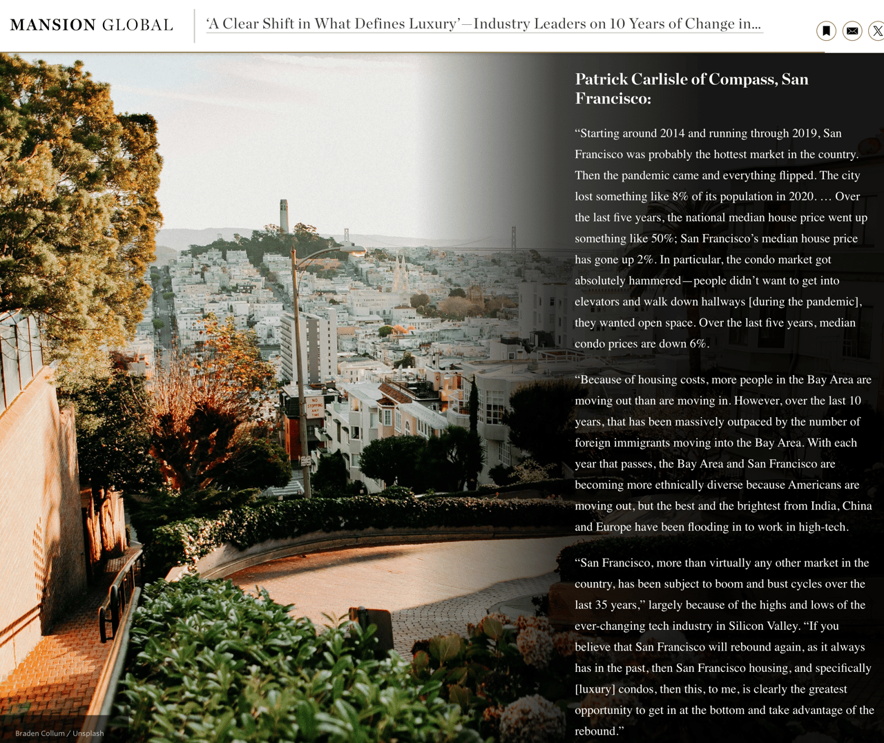 Agent Neal Ward of Compass, who wasn’t associated with the deal, said the San Francisco market is the strongest he has seen in more than 30 years, fueled by the AI boom as well as buyers in private equity, hedge funds and venture capital. “Huge amounts of wealth are being created at this moment,” Ward said, noting that first-time buyers in their 30s are snapping up $5 million to $30 million homes. “We’re at levels we’ve never seen.”